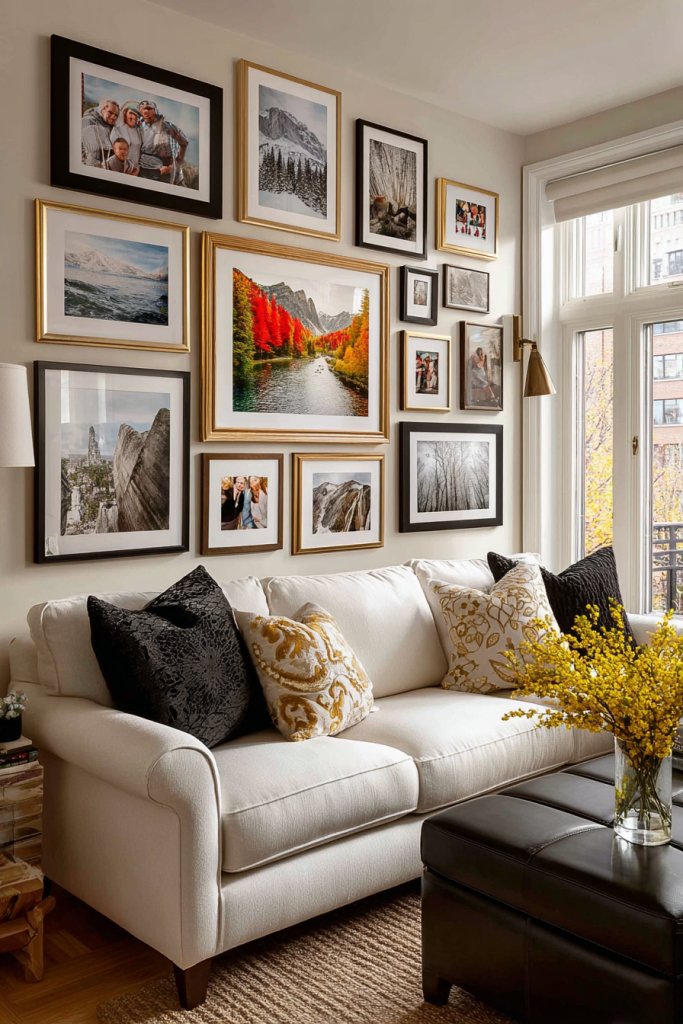 1. Gallery Wall of Framed Photographs and Art Prints for Personal Charm