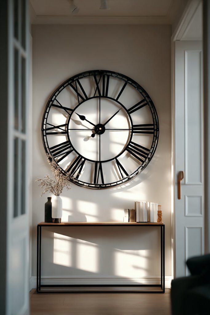 Visualize a large, modern clock with an oversized face and metallic accents hanging above your sofa. Its abstract design and vibrant colors turn time-telling into an art form. The clock’s hands move gracefully, catching the light and adding subtle motion to the wall. It’s a striking focal point that doubles as a piece of modern art.