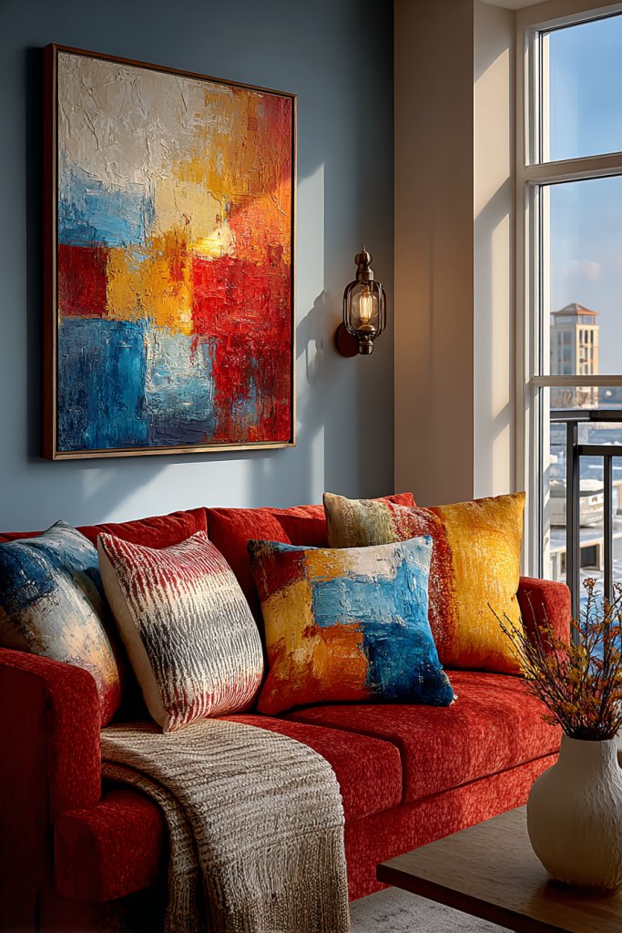Picture a large canvas with sweeping brushstrokes in vibrant reds, blues, and golds. The abstract forms evoke emotion and curiosity, inviting viewers to interpret the shapes. The textured paint adds depth, catching light differently throughout the day. The artwork anchors the room and ties together various decor elements with its dynamic presence.