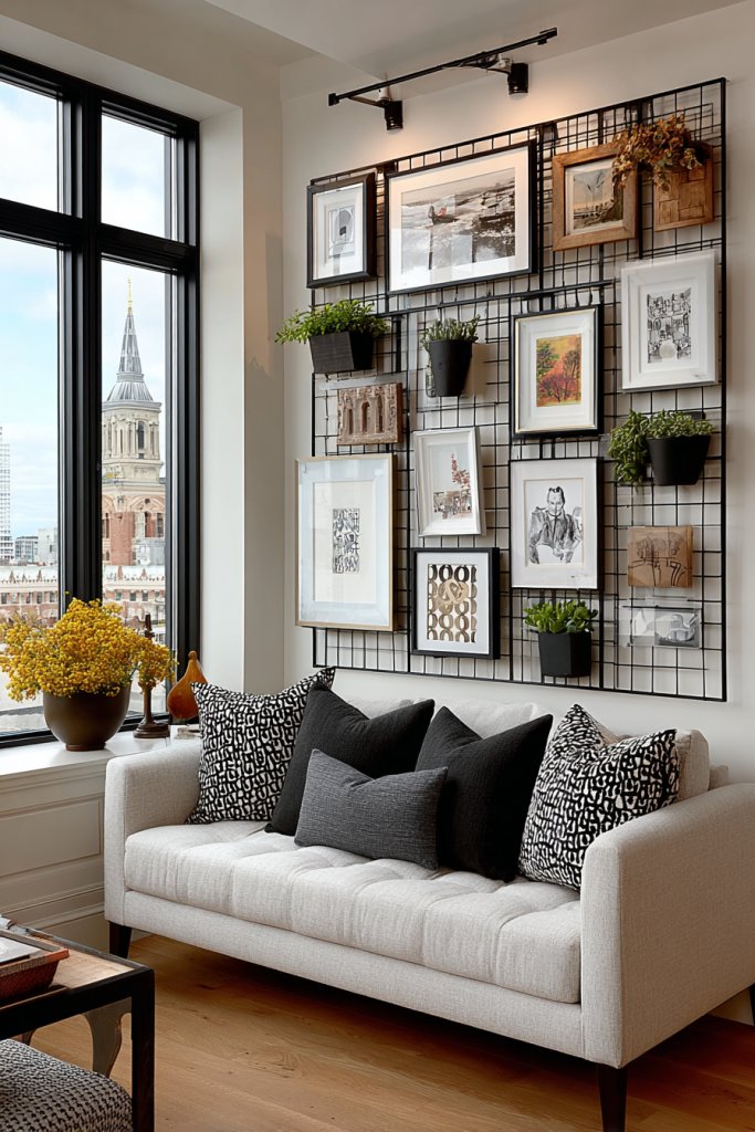 Looking for a versatile, changeable wall display? A wire grid or pegboard wall gives you the flexibility to showcase art, photos, or small decor items without permanence. It’s perfect for creative minds who love switching things up. Plus, it keeps your living room looking fresh and organized.