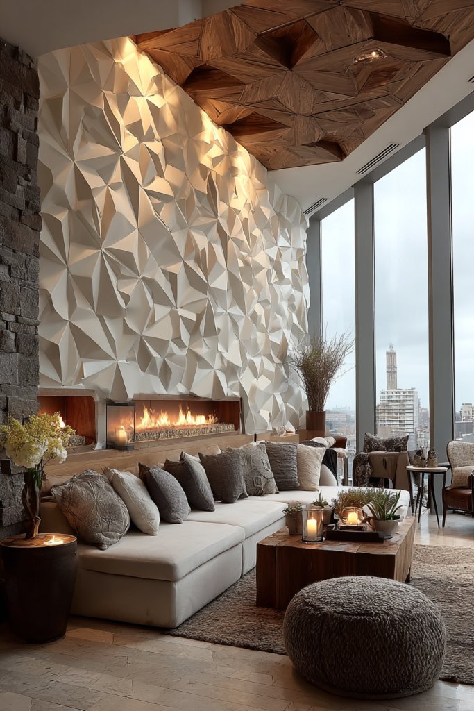 Imagine panels with geometric patterns, wave-like ripples, or subtle embossed designs. In neutral tones or bold colors, these panels create a layered visual effect that catches the light differently throughout the day. The textured surface invites touch and curiosity, transforming your wall into a piece of art. The interplay of shadows and light amplifies the room’s depth.