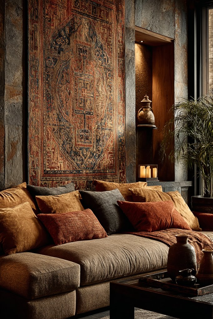 Picture a large, boho-inspired tapestry with intricate patterns hanging behind your sofa. The fabric’s rich textures and vibrant colors soften the room’s edges, creating a relaxed, welcoming vibe. Light filters through the textile, casting gentle shadows and adding a sense of depth. The tactile surface invites touch and adds visual warmth to your decor.