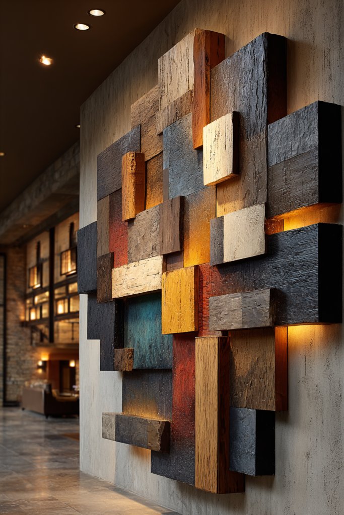 Imagine a set of four or six panels arranged in a grid or pattern, each with abstract shapes or textured finishes. The separate pieces come together to form a cohesive artwork, but can also be shifted for different layouts. The varied textures and finishes create depth and movement, making the wall dynamic and engaging. It’s like a puzzle that turns into art.