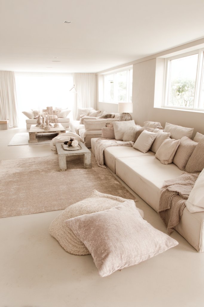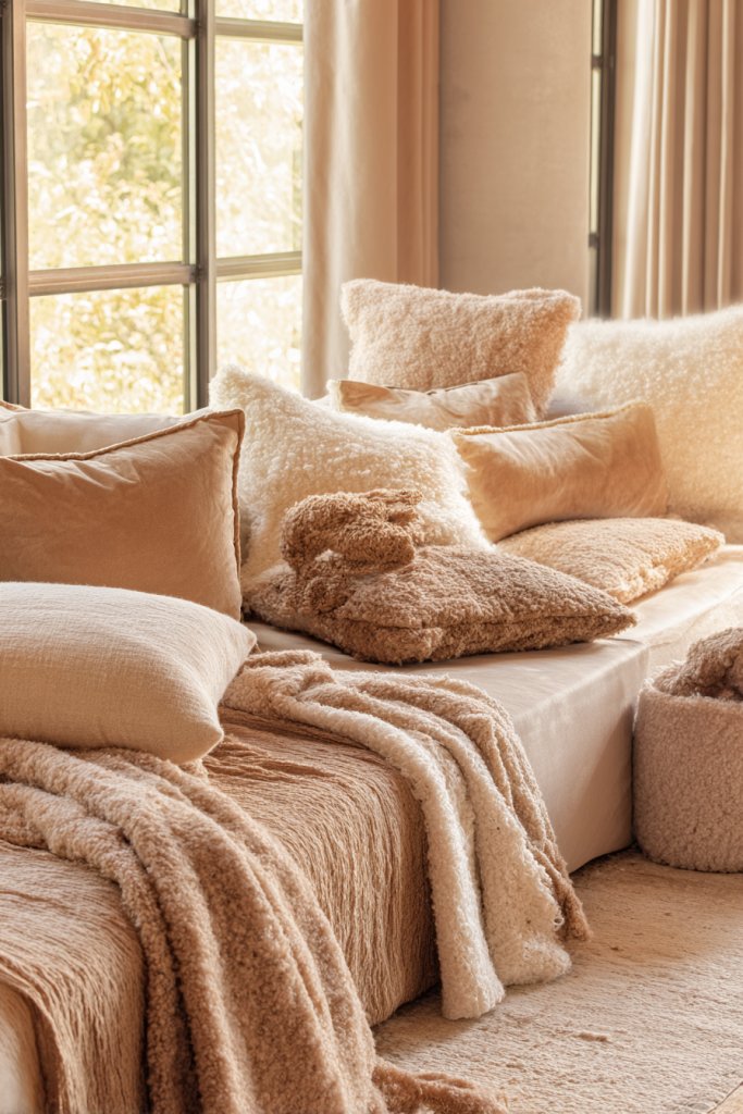 Imagine plush throws draped over sofas, textured cushions in warm shades, and soft area rugs underfoot. Warm tones like caramel, rust, or beige dominate the palette, creating a soothing backdrop. Layering different textures—knits, velvets, and woven fabrics—adds depth and tactile interest. The overall effect is inviting and relaxing.