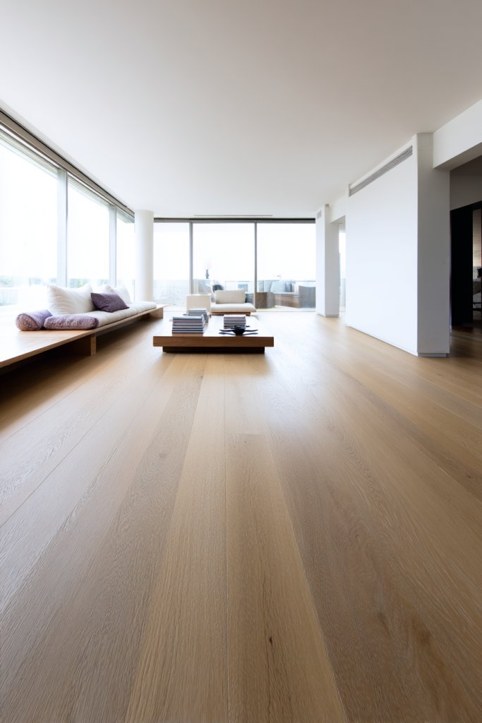 Imagine hardwood planks or large-format tiles running uninterrupted across the entire length of your living area. The seamless surface guides the eye along the room’s axis, emphasizing its length. The consistent material and color create a clean, harmonious background that allows your furniture and decor to stand out.