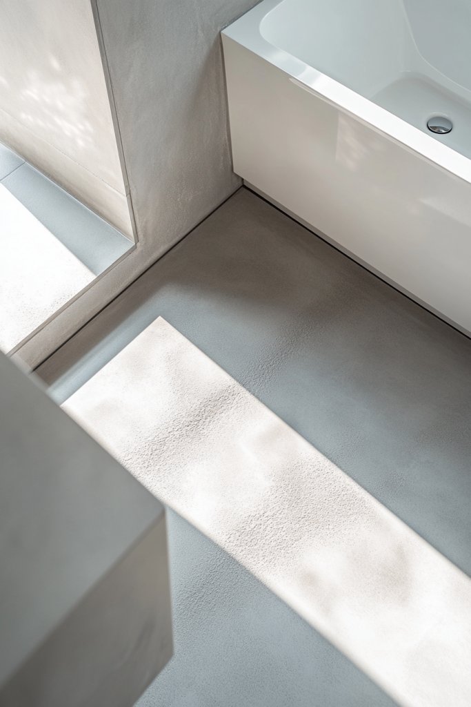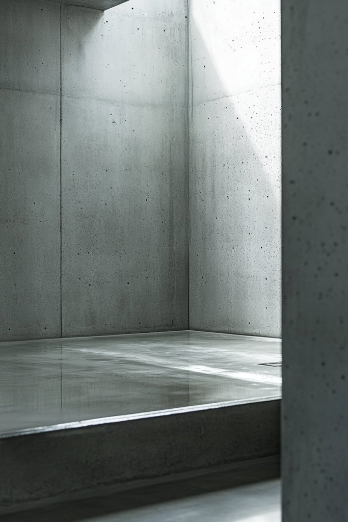 Picture a space where the entire shower area is wrapped in a single slab of textured concrete, flowing from floor to wall with no interruptions. The surface has a matte finish, accentuating its natural character. Light reflects softly off the smooth, uninterrupted surface, creating a calming, spa-like atmosphere. The lack of seams makes the space feel larger and more cohesive, emphasizing clean lines and minimalist elegance. Shadows play along the curves and edges, adding depth.