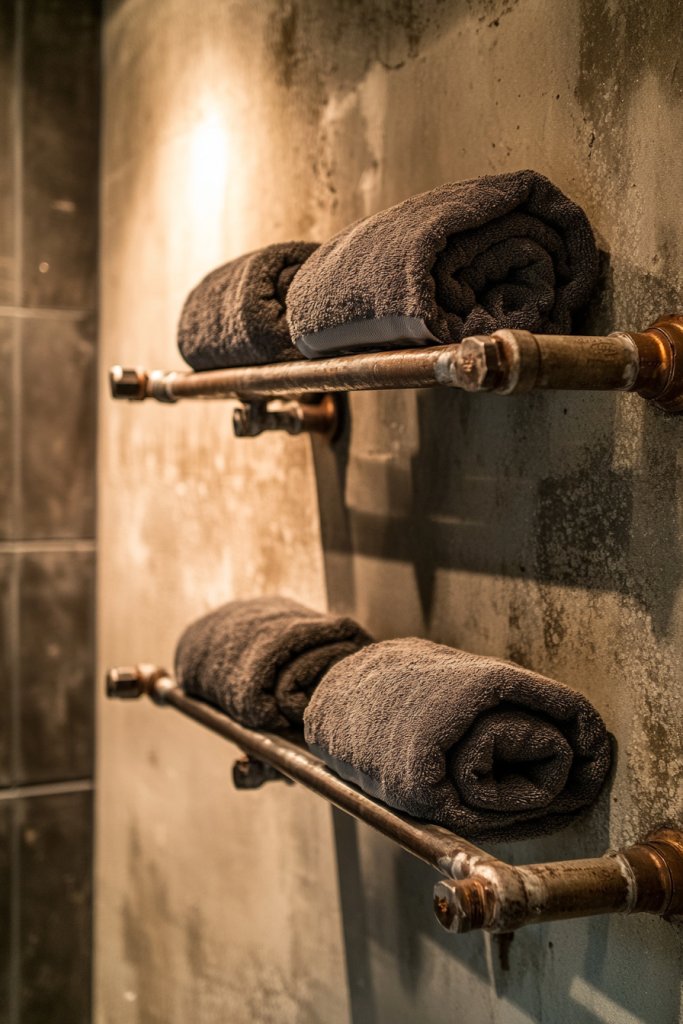 Use different pipe sizes and finishes—brushed, matte black, or galvanized—to match your overall theme. Incorporate decorative valves or fittings for added vintage appeal. These pipes can be mounted in discreet or prominent locations, depending on your preference. During seasonal updates, swap out fixtures or add fabric or leather straps for hanging items. This approach works well in both small and large industrial-inspired bathrooms.