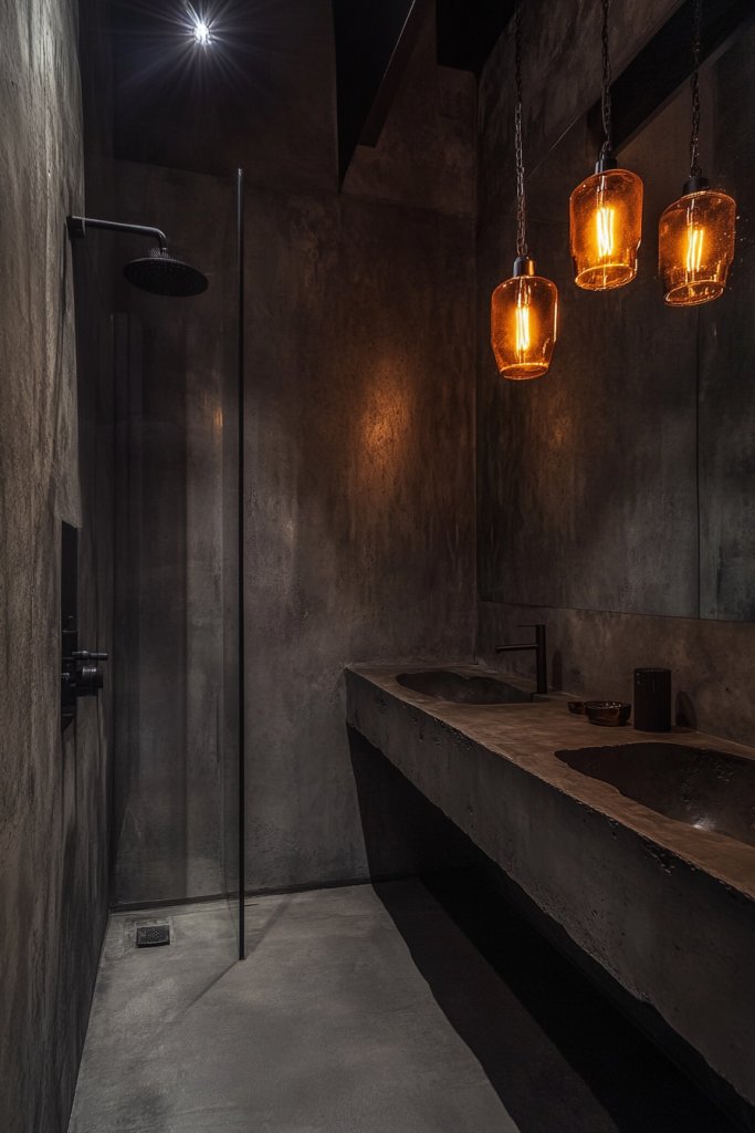 Visualize warm-toned filament bulbs hanging from black metal fixtures, casting a soft amber glow over textured concrete walls. The light highlights the rough textures, creating shadows that add depth and intimacy. The contrast between the cool gray concrete and warm lighting creates a cozy yet modern atmosphere. The glow reflects subtly on water droplets and textured surfaces, enhancing the tactile feel. It’s like combining the best of both worlds—raw and refined.