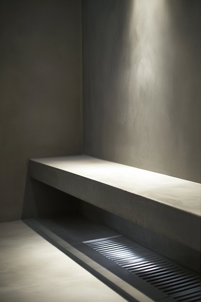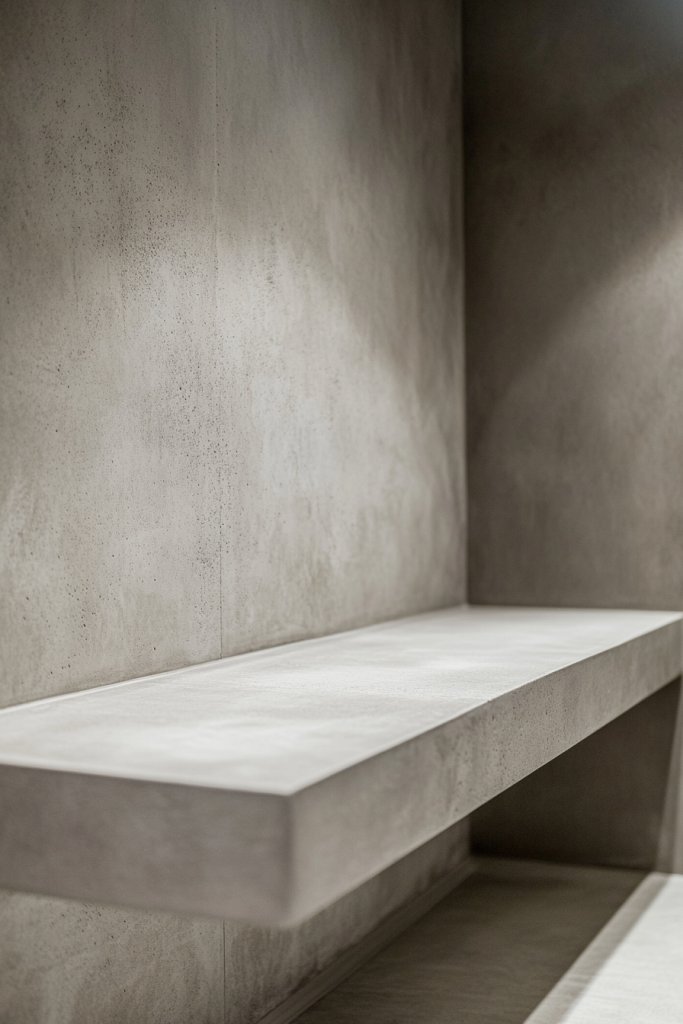 Visualize a sleek, rectangular concrete bench built into the corner or along the wall of your shower. Its surface is smooth but textured enough to prevent slipping. The drainage system is subtly incorporated into the design, with a slight slope directing water toward hidden drains. The bench appears as an architectural element—part sculpture, part functional furniture—blending seamlessly with the concrete walls. Under soft lighting, it becomes an inviting space to relax or organize your essentials.