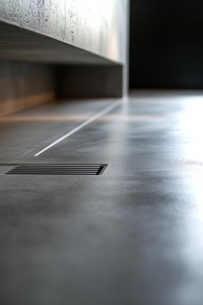 Picture a concrete floor with a discreet, linear or concealed drain inset flush with the surface. The floor slopes gently toward the drain, which is hidden beneath a narrow slit or grate that blends into the concrete. The water flows effortlessly into the concealed system, ensuring safety and cleanliness. The entire surface looks like a solid slab without interruption, emphasizing the sleek, minimalist aesthetic. It feels almost invisible, letting the concrete and fixtures take center stage.