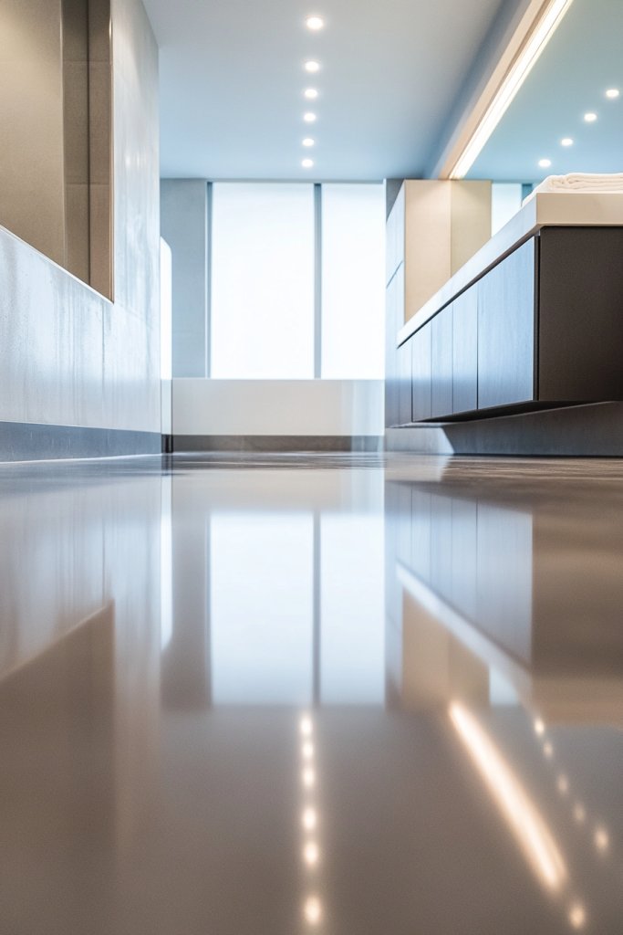 For a warmer look, incorporate underfloor heating beneath the polished surface. You can also add textured mats or rugs in specific areas for comfort without disrupting the sleek aesthetic. Seasonal adjustments like adding a soft towel or a decorative pebble strip can change the feel without altering the concrete. If your space is limited, keep the lighting minimal so the concrete’s reflective quality remains the star of the show. Consider contrasting with matte fixtures or colored accents elsewhere to break the monotony.