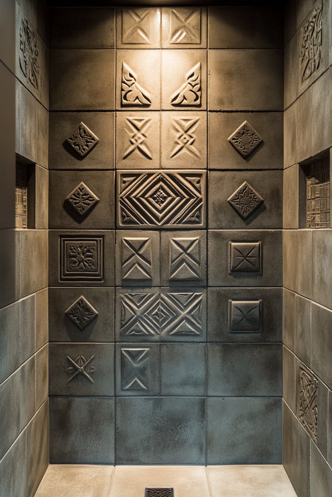 Imagine a wall decorated with square or hexagonal concrete tiles featuring stamped patterns—be it geometric lines, abstract shapes, or subtle textures. The tiles have a matte or textured finish, adding depth and tactile appeal. Light plays off their surface, creating shadows that emphasize the pattern. The overall look is contemporary and artistic, with a tactile richness that invites exploration. It’s a perfect backdrop for minimalist fixtures or industrial accents.