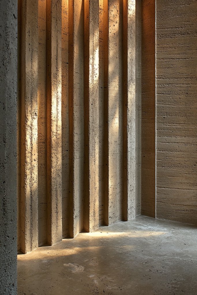 Highlight the textured surface with directional lighting that accentuates the grooves. Complement the walls with sleek, minimalist fixtures that don’t compete with the pattern. Consider adding a contrasting color stain inside the grooves for visual pop. Small decorative elements like a textured bench or sculptural accents can enhance the industrial feel while keeping the focus on the textured walls.