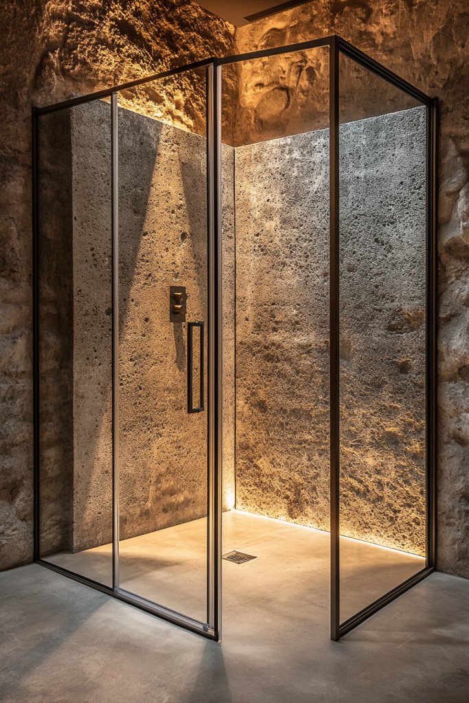 Start by precise measurements for the glass enclosure and concrete wall. Use tempered, water-resistant glass with minimal framing or edge detailing. Finish the concrete with a matte or lightly textured surface, sealed against water and stains. Mount the glass securely with specialized hardware, ensuring a watertight seal. Regular cleaning with glass-safe products keeps the enclosure pristine and the concrete looking sleek.