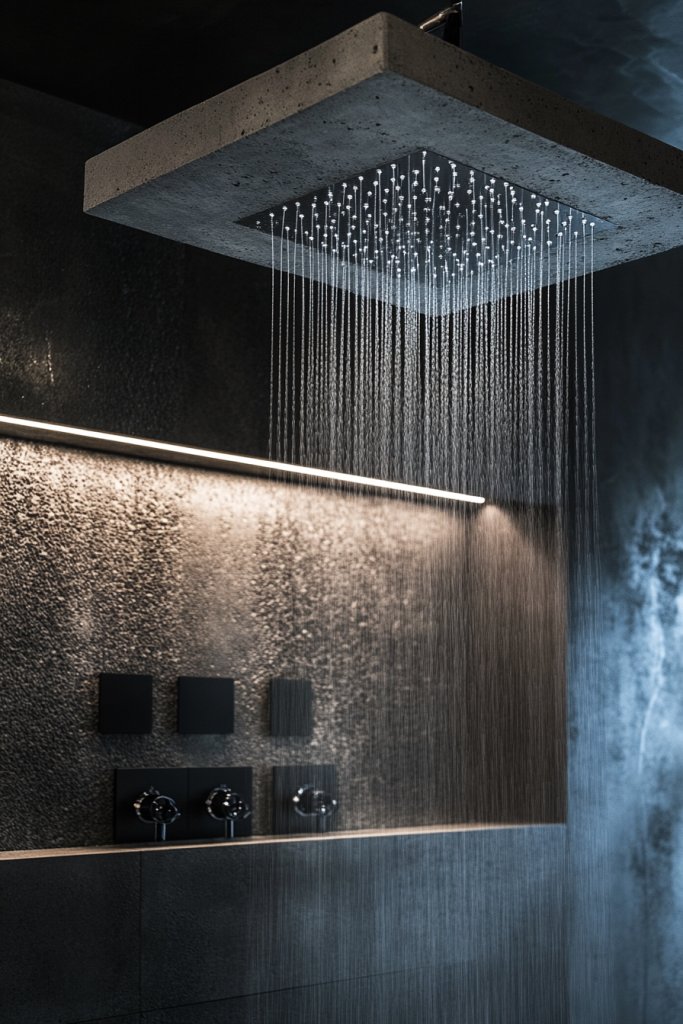 A textured concrete ceiling with recessed spotlights demonstrates how thoughtful lighting can redefine a space. It’s a subtle yet impactful feature that adds height, texture, and ambiance. With a bit of effort, you turn your shower into a modern architectural statement. Who knew ceilings could be so inspiring?