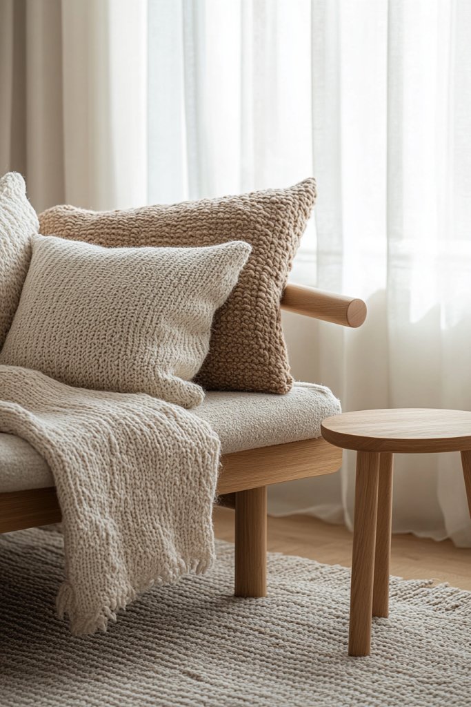 Start with a neutral color base—think off-white walls and light wooden flooring. Add textured textiles like a cozy throw or soft cushions in muted tones. Minimalist furniture with natural finishes—such as a simple wood coffee table or streamlined sofa—works best. Incorporate natural materials like wool, linen, and cotton, avoiding overly ornate decor. Keep clutter minimal to preserve the serenity. Small accessories like candles or woven baskets can add subtle warmth without overwhelming.