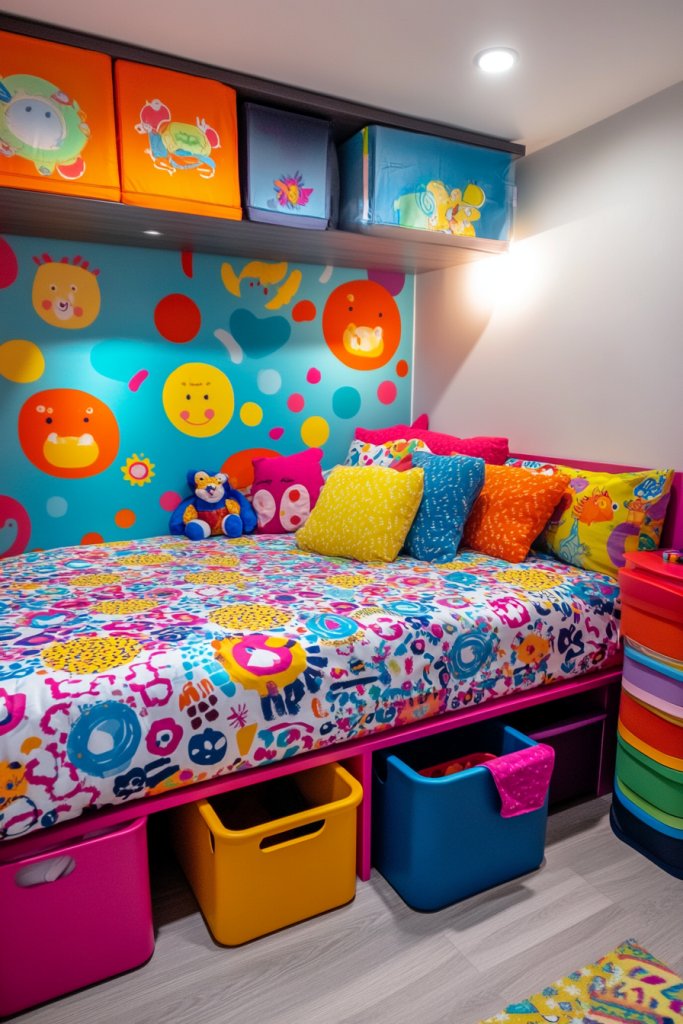 Envision walls painted in cheerful shades—like sunny yellow or playful turquoise—paired with fun patterns in wallpaper or decals. Incorporate colorful cushions, playful rugs, and easy-to-access storage bins. Furniture features rounded edges, bright finishes, and multi-use pieces like a bed with built-in drawers. Fun elements like a chalkboard wall or a canopy bed add whimsy and encourage play.