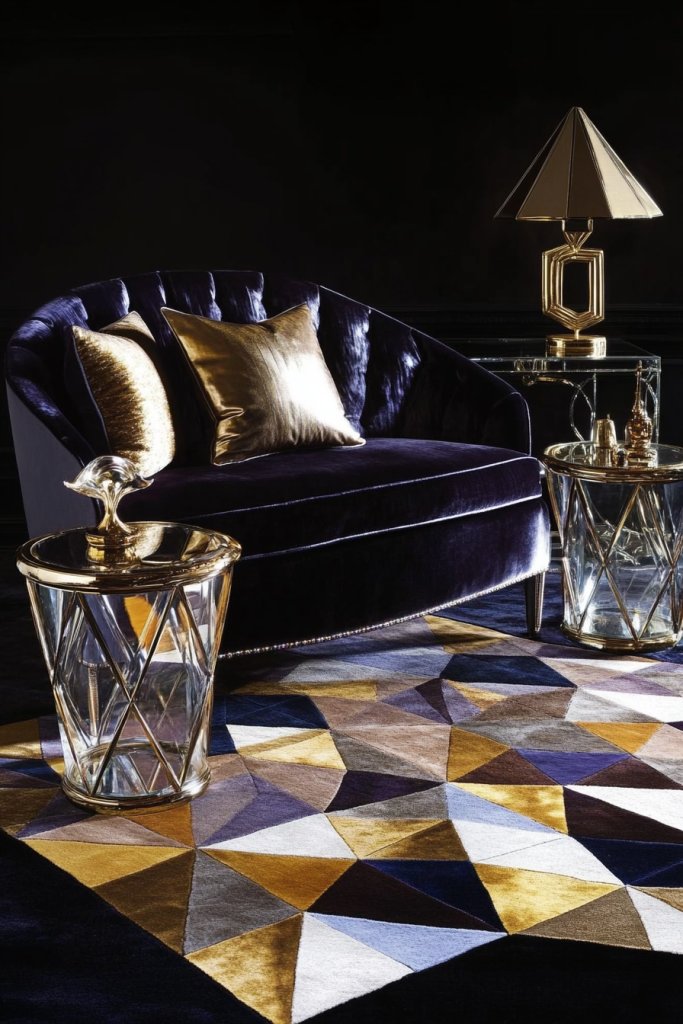 Start with a neutral base—perhaps deep navy or charcoal walls—and layer in luxurious textiles like velvet or silk. Use metallic finishes—gold, brass, or chrome—in fixtures and decor. Incorporate mirrors, geometric rugs, or art deco sculptures to emphasize the theme. Choose furniture with sleek, curved lines, and include statement lighting such as a crystal chandelier or art deco sconces. Keep the room uncluttered to maintain its glamorous appeal. Accessories like mirrored trays or geometric sculptures tie the theme together.