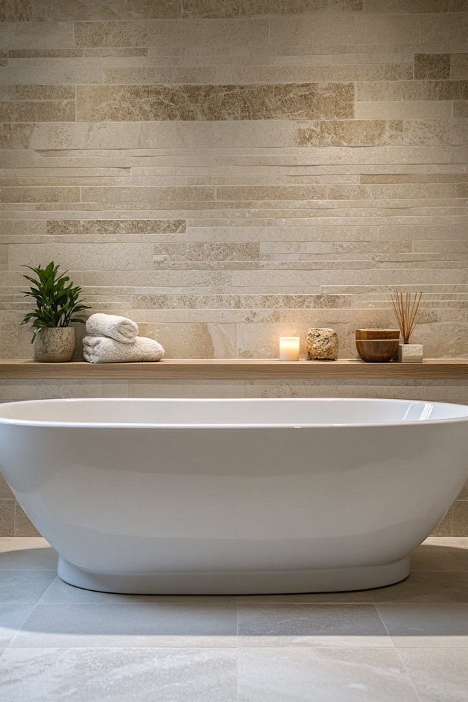 Imagine neutral tones—soft taupe, gentle greys, and warm whites—complemented by natural textures like stone and wood. Keep surfaces uncluttered, with sleek fixtures and minimal accessories. Incorporate natural elements like smooth pebbles, bamboo accessories, or organic-shaped ceramics to evoke a sense of calm. Soft, diffused lighting and water features—like a small fountain—enhance the tranquil ambiance, making it a true retreat.