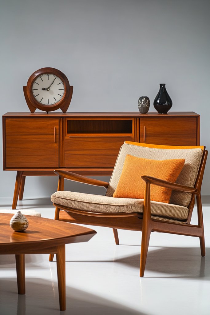 Think of furniture with tapered legs, smooth surfaces, and organic shapes—like a sleek wooden sideboard or a low-profile sofa. The color palette focuses on earthy tones—mustard, teal, walnut—balanced with neutral shades. Decor includes geometric rugs, minimalist art, and vintage-inspired accessories. The overall vibe is warm, inviting, and effortlessly stylish, blending retro charm with modern sensibility.