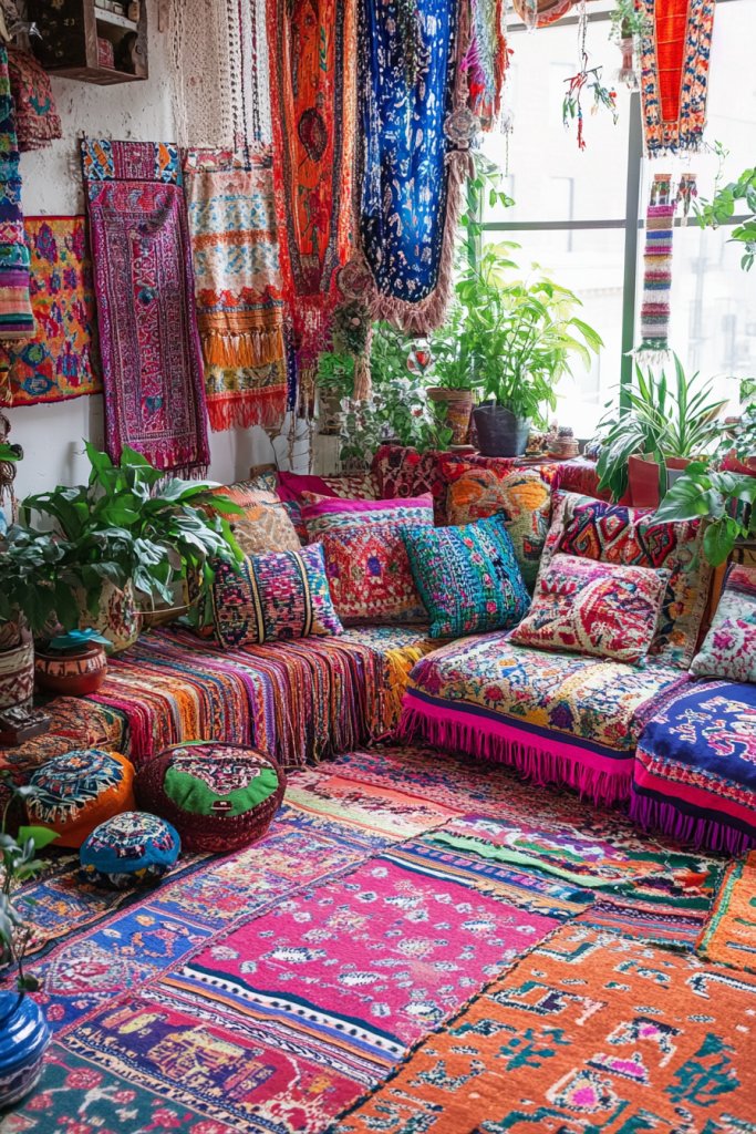 Imagine a riot of colors—deep reds, vibrant oranges, and lush teals—draped across mismatched textiles and layered rugs. Mix in patterned cushions, fringed throws, and a collection of vintage accessories. The furniture might include a distressed wooden coffee table paired with a velvet armchair. Unconventional accessories like hanging lanterns or macramé wall hangings add to the eclectic charm, making the space feel alive and inviting.