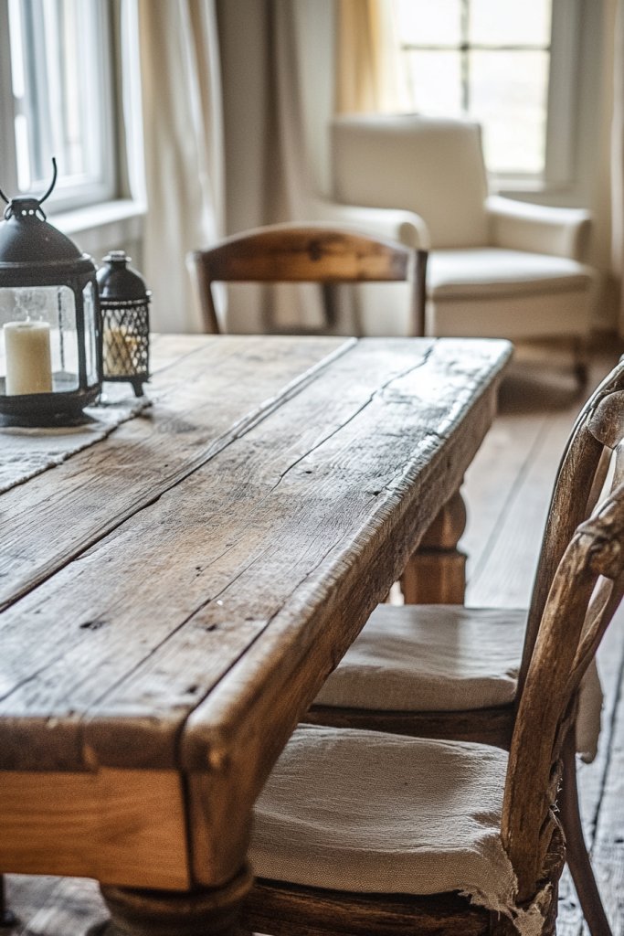Imagine distressed wood accents on furniture—think barn doors or weathered dining tables—that tell a story of history and craftsmanship. Neutral tones like creams, tans, and soft greys dominate the palette, accented by vintage accessories like lanterns or antique jars. Soft textiles such as linen curtains and plaid blankets add layers of comfort. The overall aesthetic is imperfectly perfect—charming, cozy, and full of rustic details.