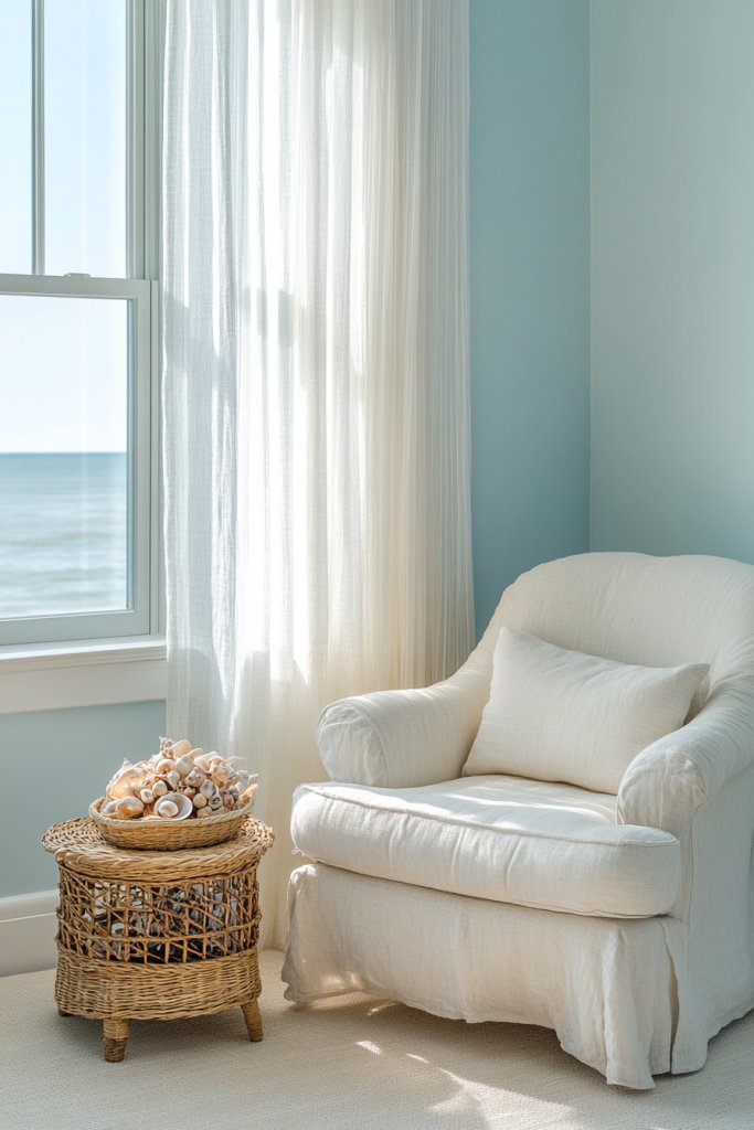 Visualize a room filled with shades of soft blue, sandy beige, and crisp white. Natural fibers like jute rugs and linen curtains add texture, while driftwood-inspired decor brings a touch of the outdoors inside. Light, breezy curtains flutter gently in the breeze, and woven baskets keep essentials organized. The space feels open, airy, and connected to nature, like a seaside cottage.