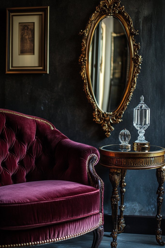 Picture plush velvet upholstery, gold accents, and mirrored surfaces that reflect light and add depth. Antique-inspired fixtures and ornate moldings create a sense of grandeur. Rich fabrics like silk or brocade adorn cushions and curtains, while vintage artwork or framed photographs add a nostalgic touch. Think of a space that whispers elegance, with a dash of drama and plenty of sparkle.