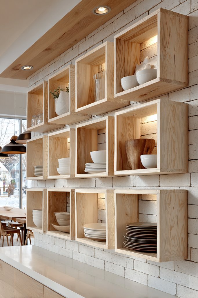 Visualize open wooden frames with simple shelves holding colorful plates, bowls, and glassware. The light filters through, creating a warm, inviting glow. The design emphasizes clean lines and craftsmanship, giving your kitchen a modern yet cozy feel. It invites you to display your favorite pieces without the fear of clutter.