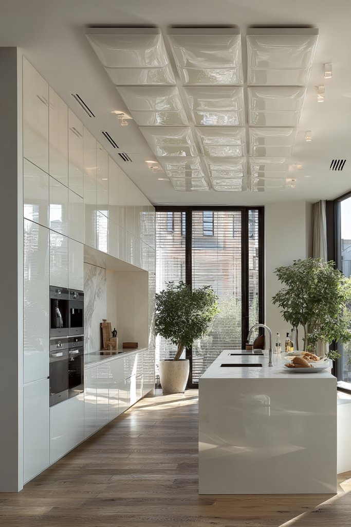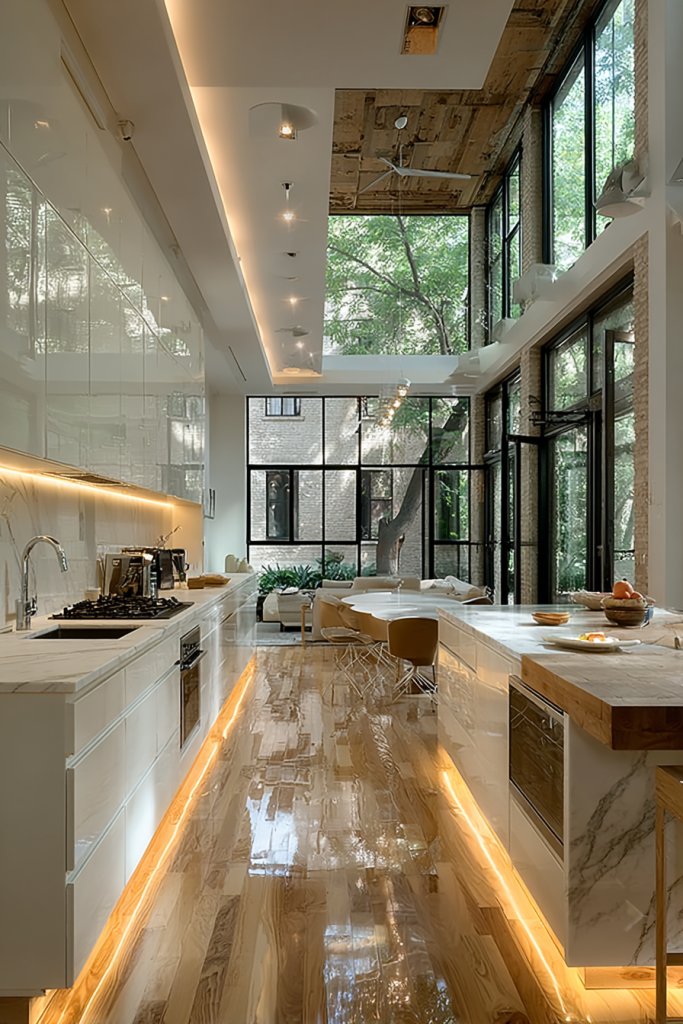 Imagine expansive windows with sleek frames that overlook your garden, filling the room with warm, natural light. Skylights installed in the ceiling create a canopy of daylight, even in the heart of your kitchen. The sunlight dances on glossy surfaces, highlighting textures and colors, and transforming the ambiance from mundane to magical.