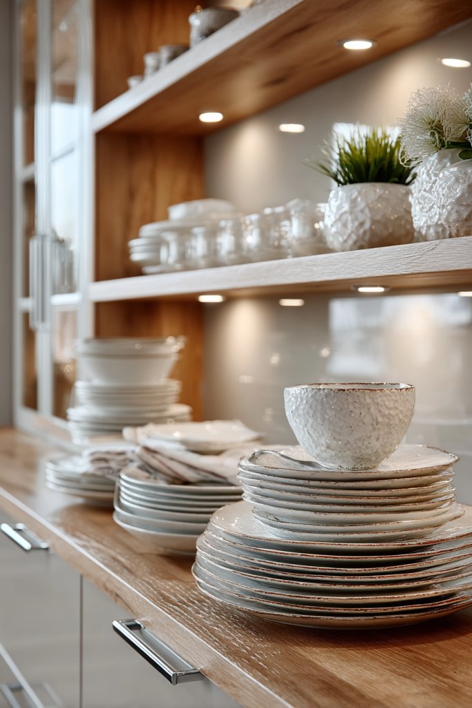 Visualize sleek wooden shelves mounted against a crisp white backsplash, displaying a colorful collection of bowls, cups, and cookbooks. The open design allows natural light to bounce around, highlighting each piece. You can see everything at a glance, which makes cooking and cleaning up quicker and more satisfying. The space feels brighter and more personalized.