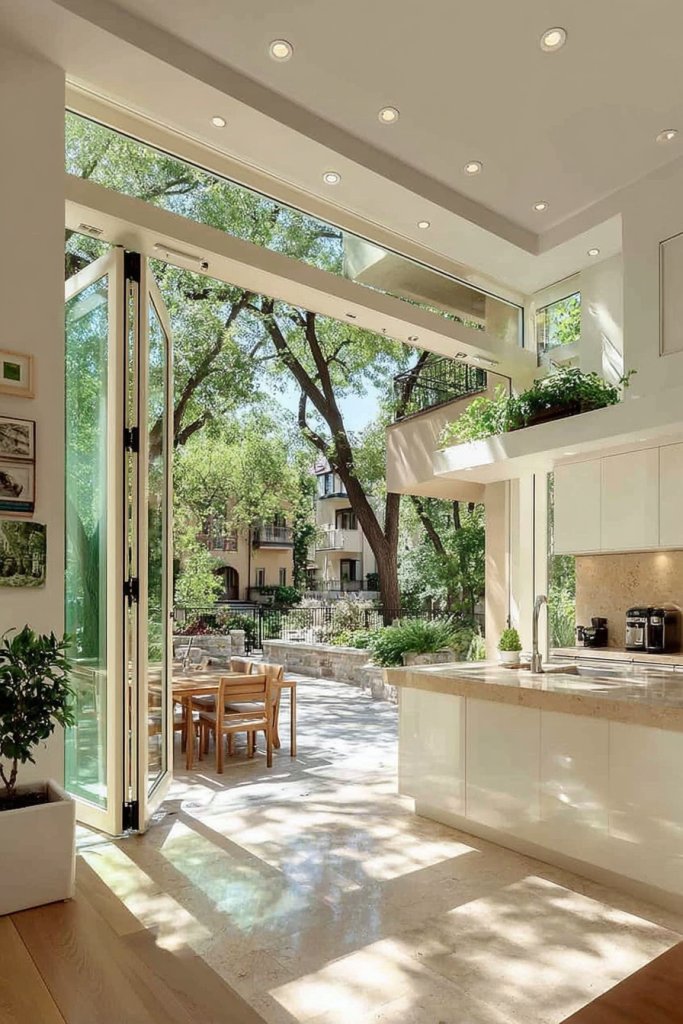 Envision large, floor-to-ceiling glass panels sliding open to reveal a lush backyard patio. The transition between indoors and out is smooth, with minimal hardware and sleek frames. During gatherings, guests can spill outside for drinks or snacks without feeling cut off. The view of greenery makes your kitchen feel brighter and more expansive.
