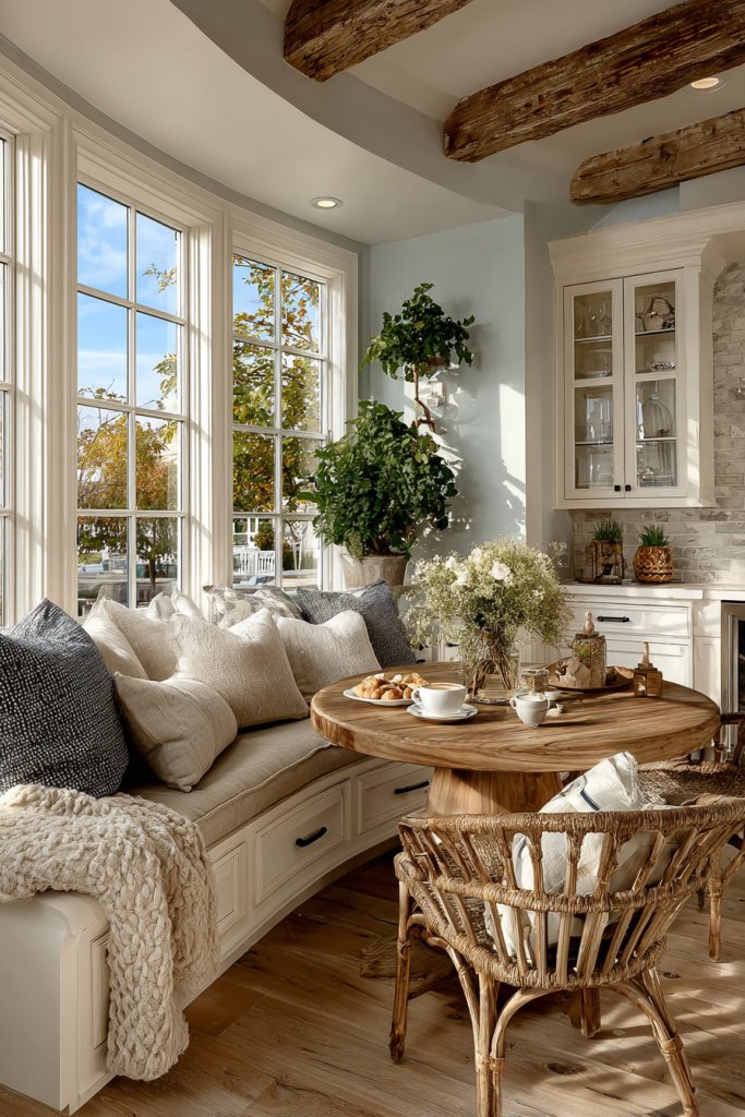 Picture a corner with a curved, upholstered bench nestled against a window, paired with a round wooden table. Soft cushions and a textured throw make the space welcoming. Natural light floods the nook, highlighting warm tones and tactile textures. It’s the perfect spot for coffee, morning papers, or chatting with loved ones.