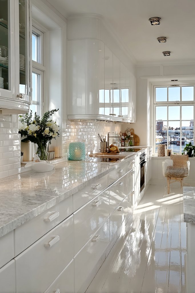 Imagine glossy white cabinets that gleam under recessed lighting, paired with a reflective backsplash that mimics the look of sleek marble. The shiny countertops catch the light, while mirrored accents subtly expand the room’s perceived size. The overall effect is a clean, modern aesthetic that feels open and crisp. The space looks effortlessly sophisticated and inviting.