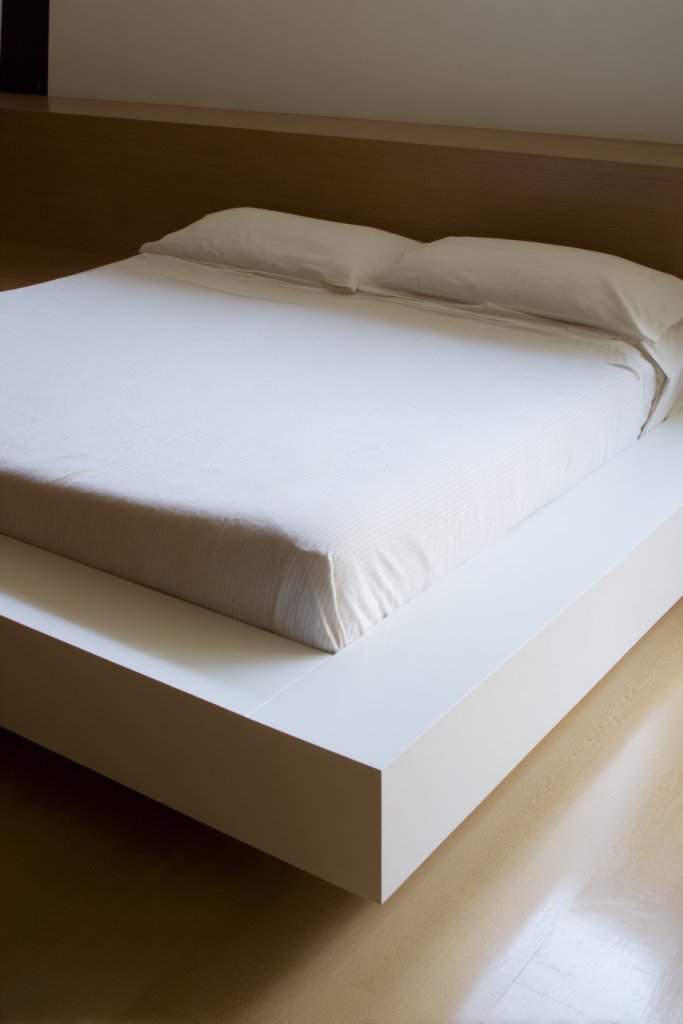 Imagine a bed with a simple, solid base in natural wood or matte black metal, sitting just above the floor. The low height makes the room feel grounded and easy to access. Bedding in neutral tones with minimal decorative pillows enhances the clean look. The absence of a bulky frame keeps sightlines open and emphasizes the room’s openness.