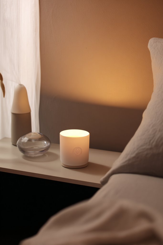 Visualize a small, sleek diffuser on your bedside table or a softly flickering candle in a simple ceramic holder. The scent wafts gently, filling the space with calming notes like lavender or eucalyptus. The warm glow of candles or the soft hum of a diffuser creates a cozy, inviting atmosphere. These elements subtly enhance your sanctuary without overwhelming visual space.
