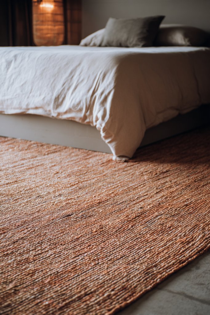 Select a rug in a size that fits your layout—at least as wide as your bed width or slightly larger. Ensure the material is natural, eco-friendly, and easy to maintain. Lay the rug flat on a clean, level surface—consider non-slip pads for safety. Keep the rug clean with regular vacuuming and spot cleaning. Position it to define the sleeping or lounging area.