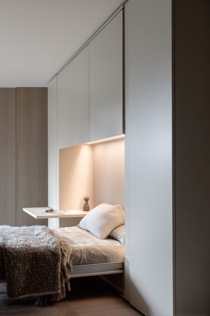 Picture a bed with built-in drawers or a fold-out desk that doubles as a vanity. These pieces blend seamlessly into the space, offering storage and surface area without crowding the room. The design emphasizes clean lines and neutral finishes, keeping the overall aesthetic calm and organized. The result is a clutter-free, functional environment that feels spacious.