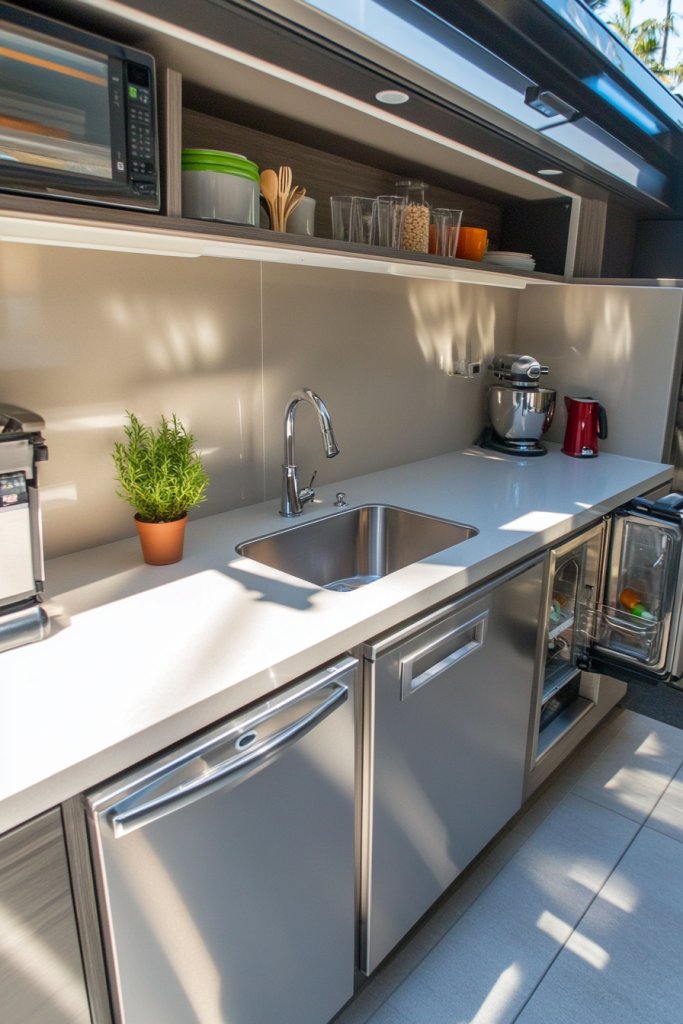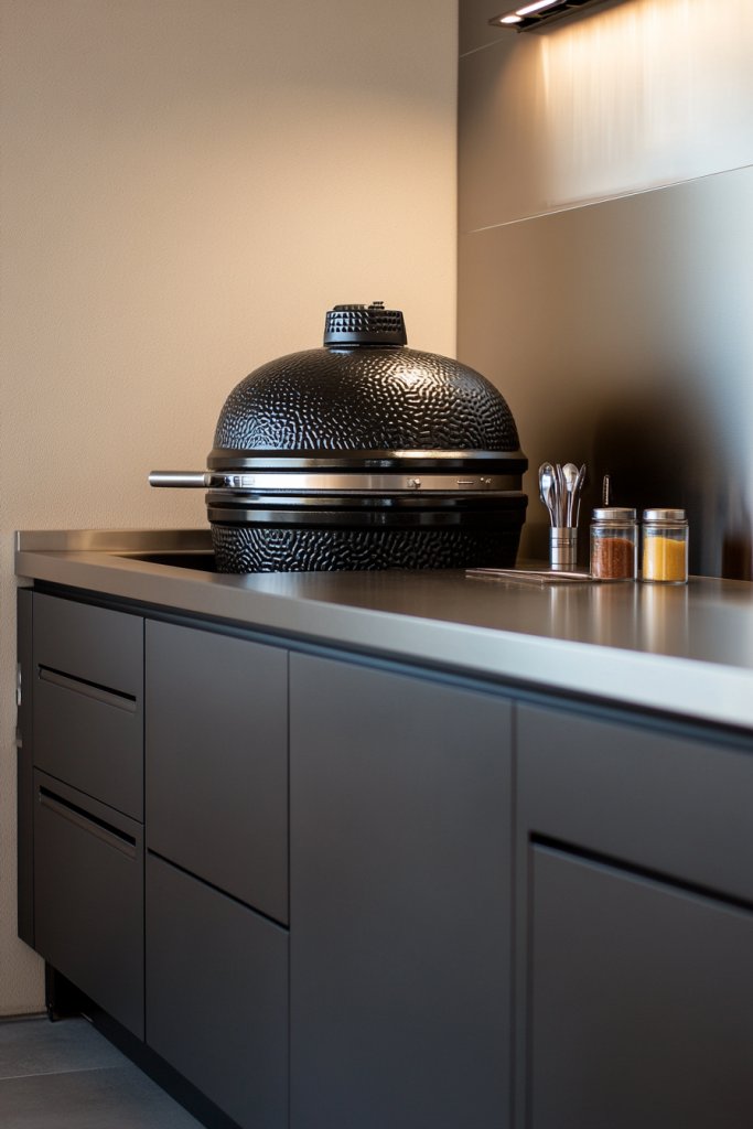 Imagine a streamlined setup with a shiny stainless steel grill embedded into a smooth quartz countertop. Shelves below hold neatly arranged utensils, and drawers hide away spices or cleaning supplies. The entire station boasts clean lines, modern metallic finishes, and subtle LED lighting that highlights your culinary domain. It’s a space that invites you to cook and entertain with confidence, all in a visually stunning environment.