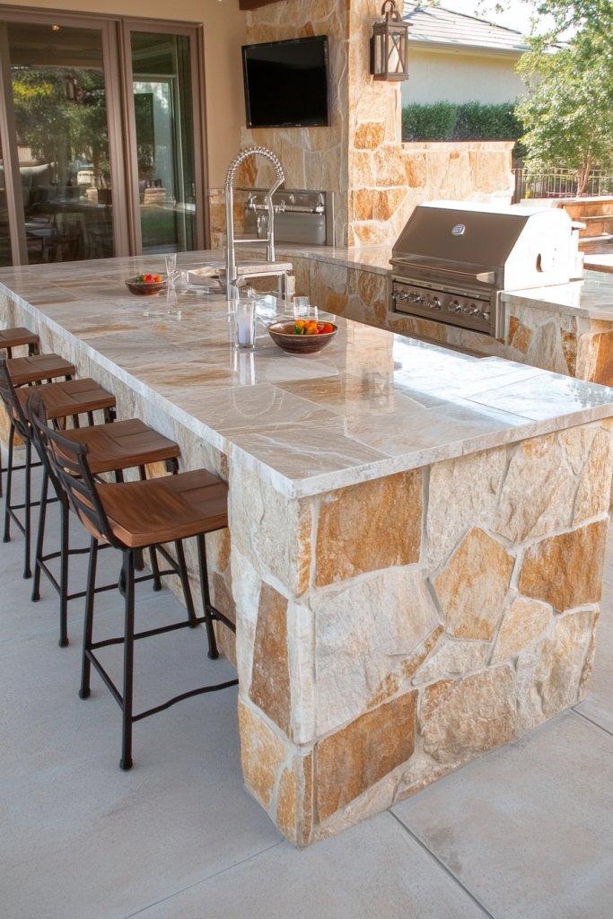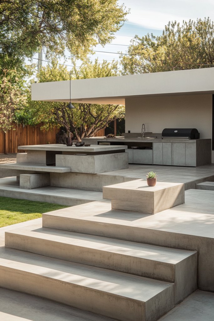 Ever wanted an outdoor kitchen that screams durability and style? A concrete countertop with an integrated sink and prep area offers just that—robust, sleek, and low-maintenance. It’s ideal for heavy use and adds a modern industrial touch to your backyard. Plus, it’s a conversation starter when guests see its polished finish.