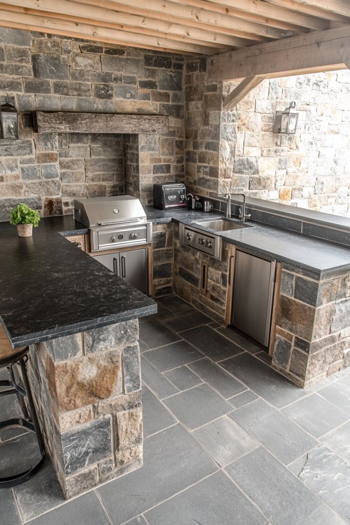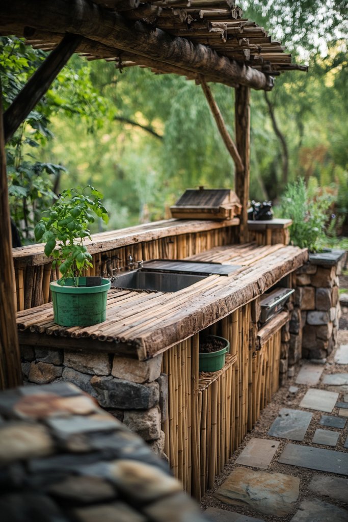 Begin with sturdy, weather-resistant wood and masonry. Install open shelving using brackets anchored into brick or stone walls, ensuring they can handle weight. Use reclaimed wood for tables and countertops to boost the rustic vibe. Seal all wood surfaces with outdoor-grade sealant to prevent warping. For the prep area, incorporate a large, durable surface like reclaimed wood or stone. Ensure proper drainage and ventilation if installing a built-in grill or sink.