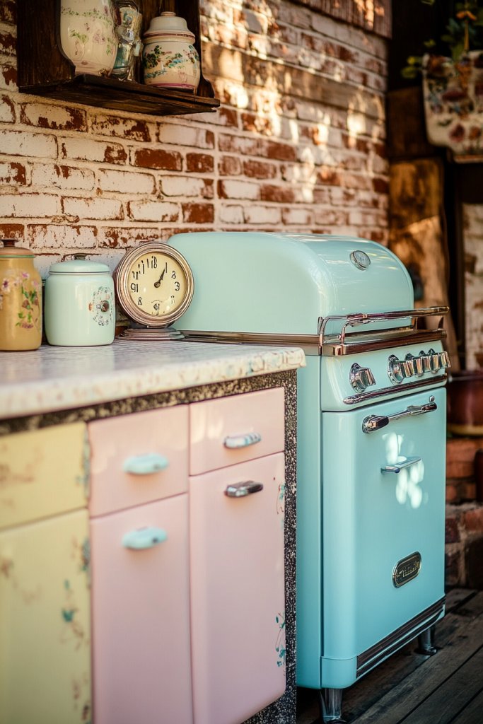 Envision pastel-colored appliances, like a vintage fridge or a retro stovetop, set against a backdrop of patterned tiles and distressed cabinetry. Open shelves display colorful cookware and vintage accessories, while a weathered wood countertop adds authenticity. The space is illuminated by classic pendant lights or lanterns, enhancing the nostalgic feel. It’s a charming, inviting space that invites guests to linger.