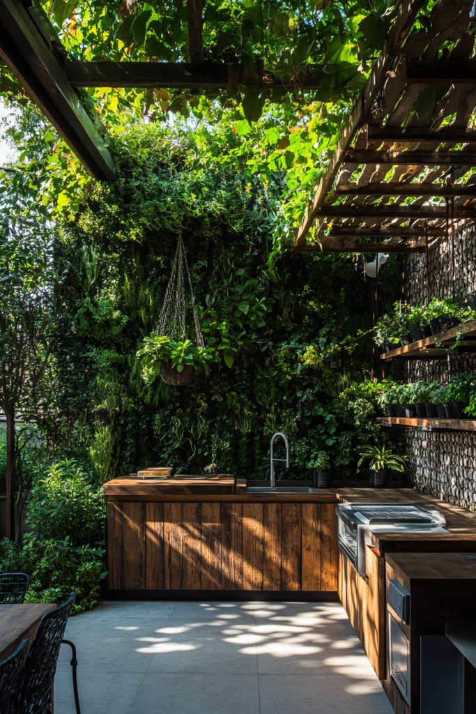Visualize a sleek outdoor kitchen with a living wall of plants or a green roof filled with succulents and herbs. The vertical garden is embedded with small planters or framed with drought-tolerant greenery, adding texture and color. The lush plants soften the hard surfaces, creating a seamless connection with nature. Natural light filters through leaves, and the scent of herbs fills the air—pure outdoor bliss.