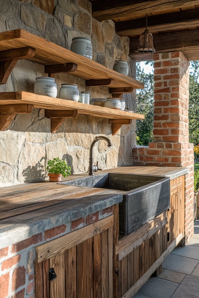2. Rustic Farmhouse Outdoor Kitchen with Open Shelving
