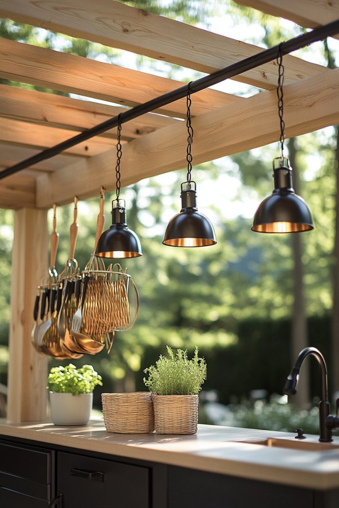 5. Pergola-Shaded Kitchen with Hanging Storage and Pendant Lighting