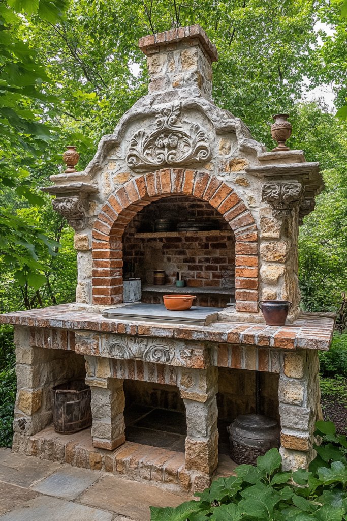 9. Stone and Brick Outdoor Kitchen with Custom Masonry