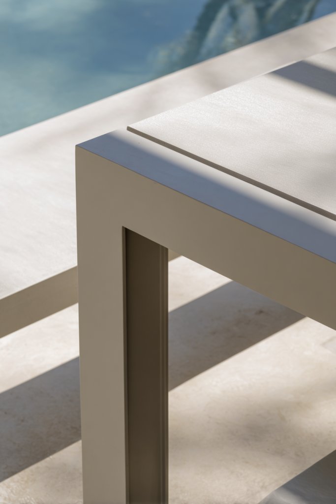 Imagine a pergola made from slim, matte-finished aluminum or wood in soft beige or gray shades. The structure features crisp geometric shapes with open sides, allowing natural light to flood the space. The ground beneath might be polished concrete or smooth pavers, with subtle textured textiles adding warmth. Soft outdoor cushions in muted tones complete the look, creating a peaceful, clutter-free retreat.