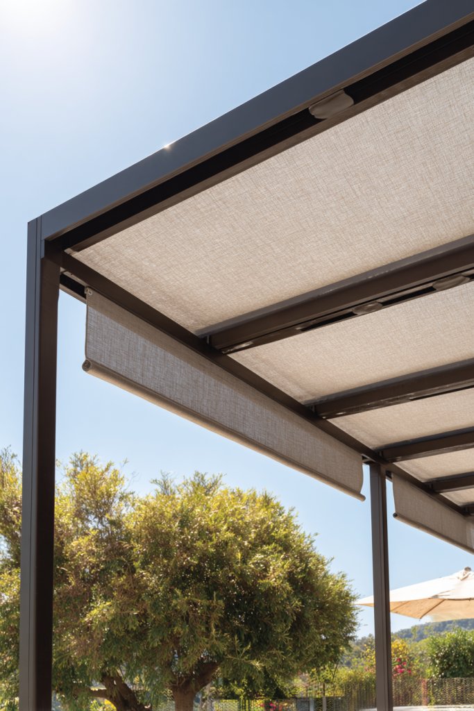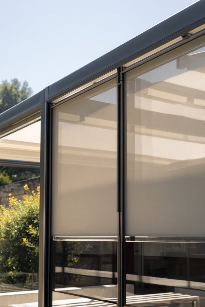 Picture sleek panels made from fabric, bamboo, or metal that slide or fold along tracks attached to the beams. During the day, you can open or fold the screens to enjoy sunlight or a breeze. For privacy or wind protection, close the panels partially or fully, creating a cozy cocoon. The structure remains uncluttered, with smartly integrated hardware that blends seamlessly into the design. Soft outdoor cushions and layered textiles make the space inviting.