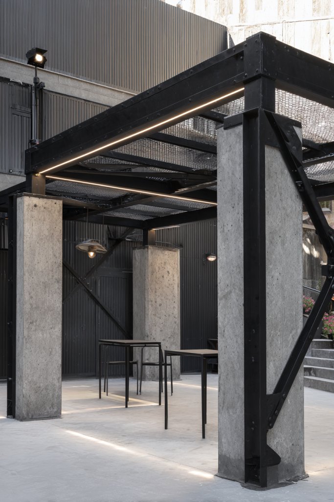 17. Industrial-Chic Pergola with Black Metal Frame and Concrete Touches