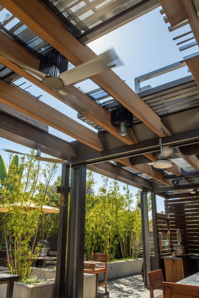 Imagine sleek ceiling fans mounted on the beams or integrated into the pergola structure, circulating air effectively. Misting systems or outdoor evaporative coolers are discreetly installed to add extra relief. The space features lightweight, weatherproof furniture in neutral tones, with textured cushions and layered textiles. Ambient lighting completes the cozy, cool atmosphere, making the space inviting day or night.